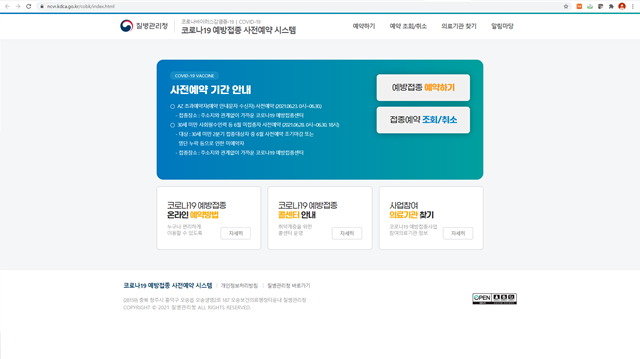 코로나 예방 접종 사전예약은 질병관리청에서 제공하고 있습니다.