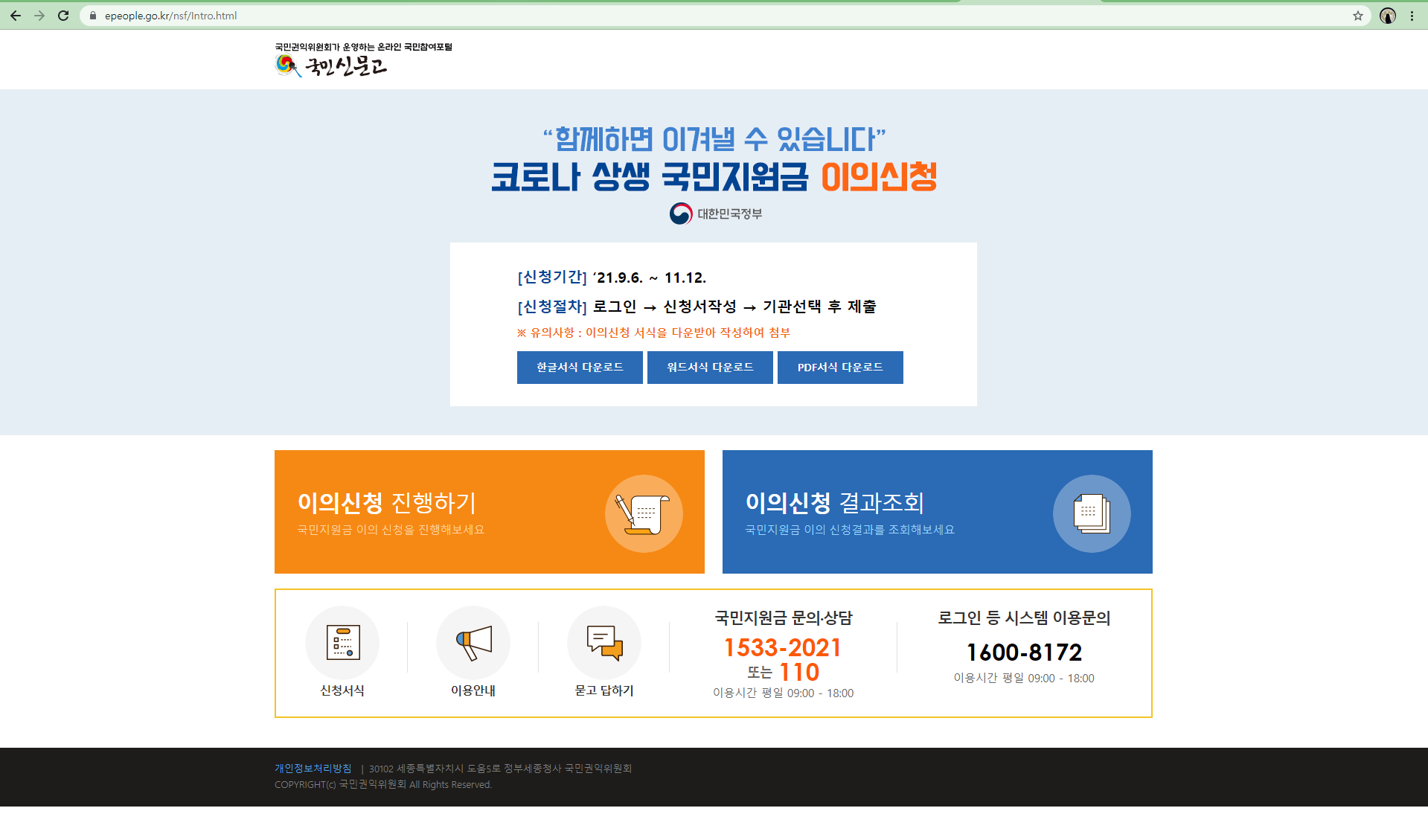 재난 지원금 이의 신청은 11월 12일까지 진행됩니다.