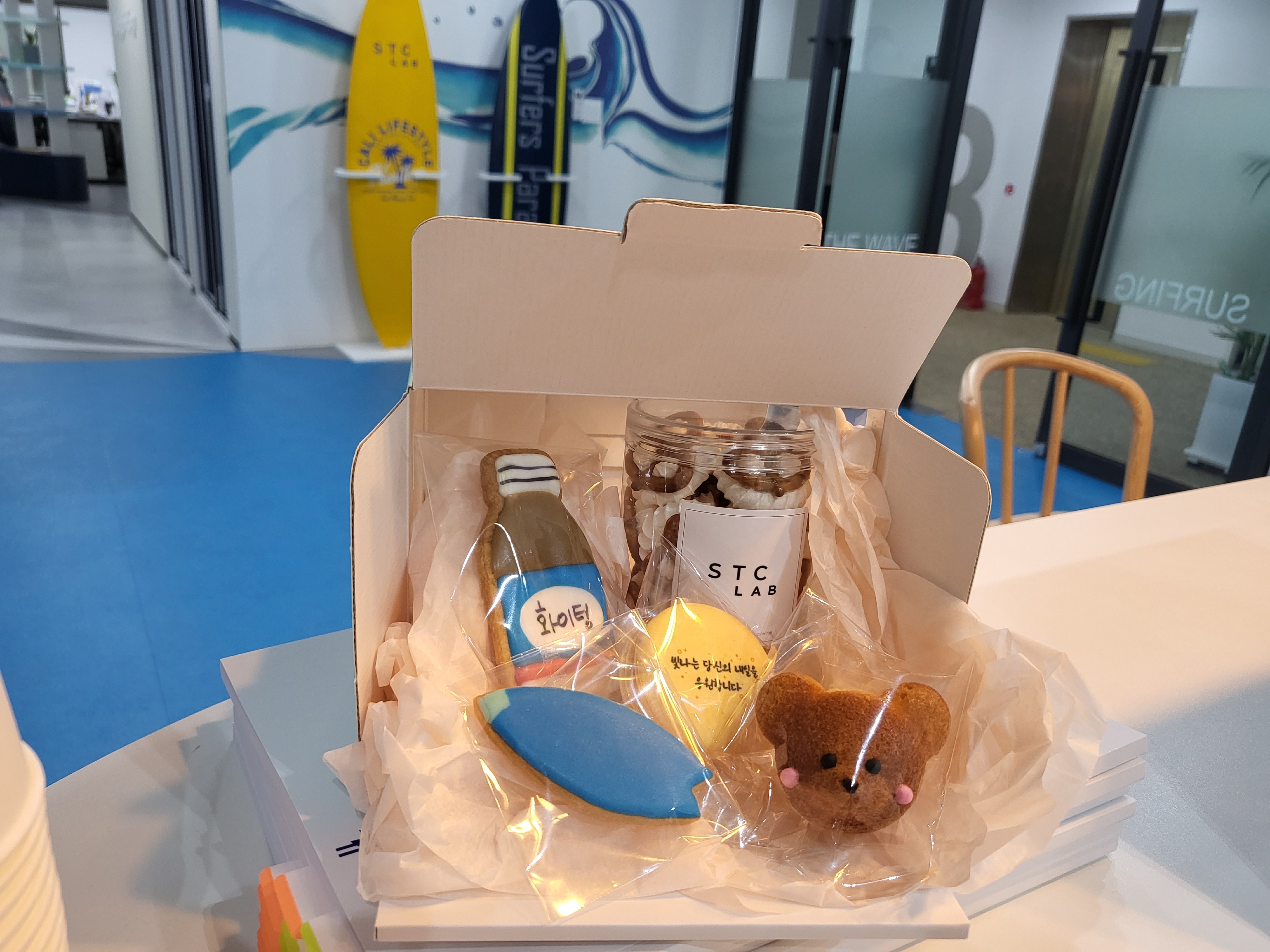 서핑보드 모양, 피로회복 음료수 모양의 쿠키와 과자, 마카롱을 준비했습니다.